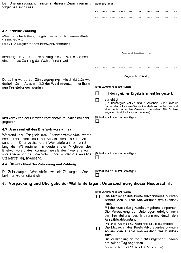 (4) Bei der Briefwahl sind die Stimmzettelumschläge vom Wähler zusammen mit dem Wahlschein in einen für beide Wahlen gemeinsamen Wahlbriefumschlag zu legen. Aufdruck und Farbe des Stimmzettelumschlages für die Briefwahl (Anlage 3) und Aufdruck des Wahlbriefumschlages (Anlage 4) sind der verbundenen Wahl anzupassen. Die Stimmzettelumschläge sollen für die Wahl der Bürgerschaft blau, bei Unionsbürgern grün und für die Wahl der Beiräte gelb sein.