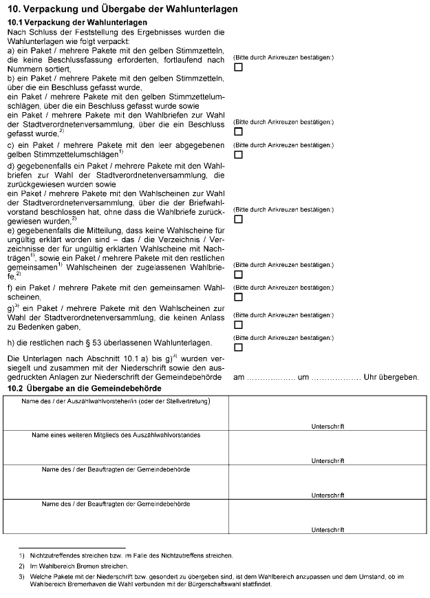 (3) Bei der Briefwahl sind die Stimmzettelumschläge vom Wähler zusammen mit dem gemeinsamen Wahlschein in einen für alle Abstimmungen gemeinsamen Wahlbriefumschlag zu legen. Aufdruck und Farbe des Stimmzettelumschlages für die Briefwahl (Anlage 3) und Aufdruck des Wahlbriefumschlages (Anlage 4) sind der verbundenen Abstimmung anzupassen. Die Stimmzettelumschläge sollen für die Wahl der Bürgerschaft blau, bei Unionsbürgern im Wahlbereich Bremen grün, für die Wahl der Beiräte gelb und für den Volksentscheid grau sein.