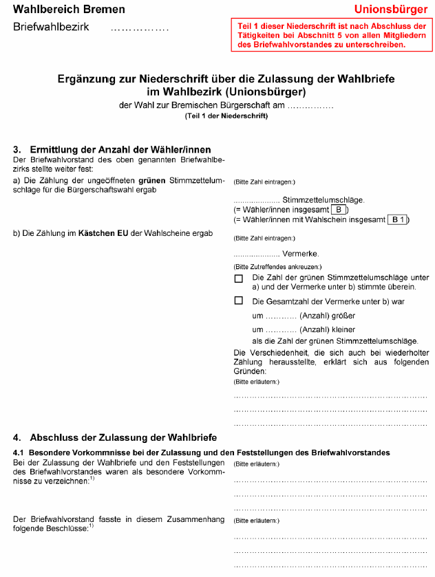 (3) Die Stimmabgaben von Inhabern eines gemeinsamen Wahlscheines werden vom Schriftführer in den oben im Wahlschein eingedruckten Kästchen BÜ oder EU für die Bürgerschaftswahl und BE für die Beiratswahl vermerkt.